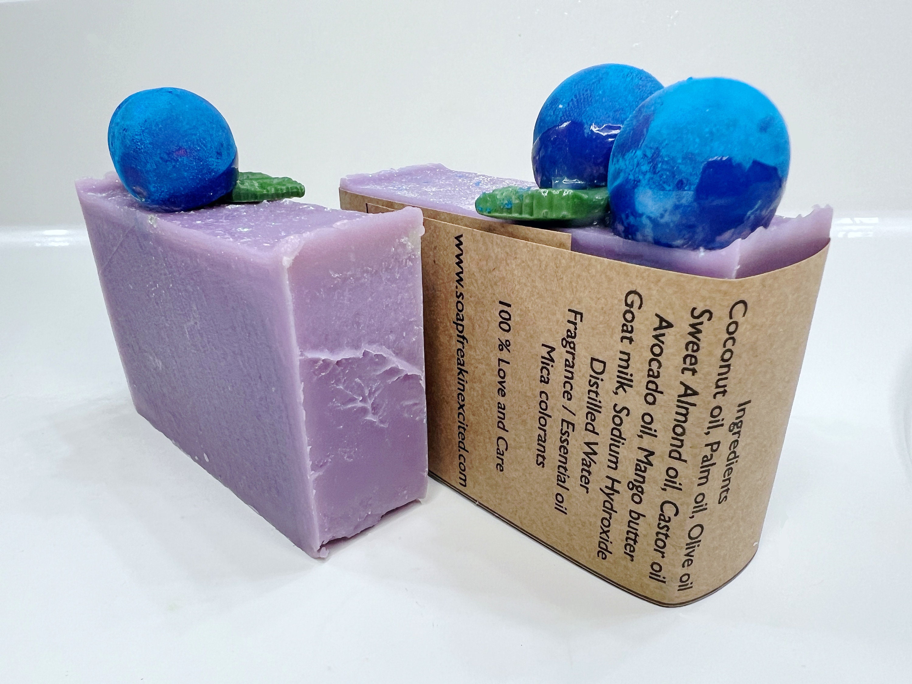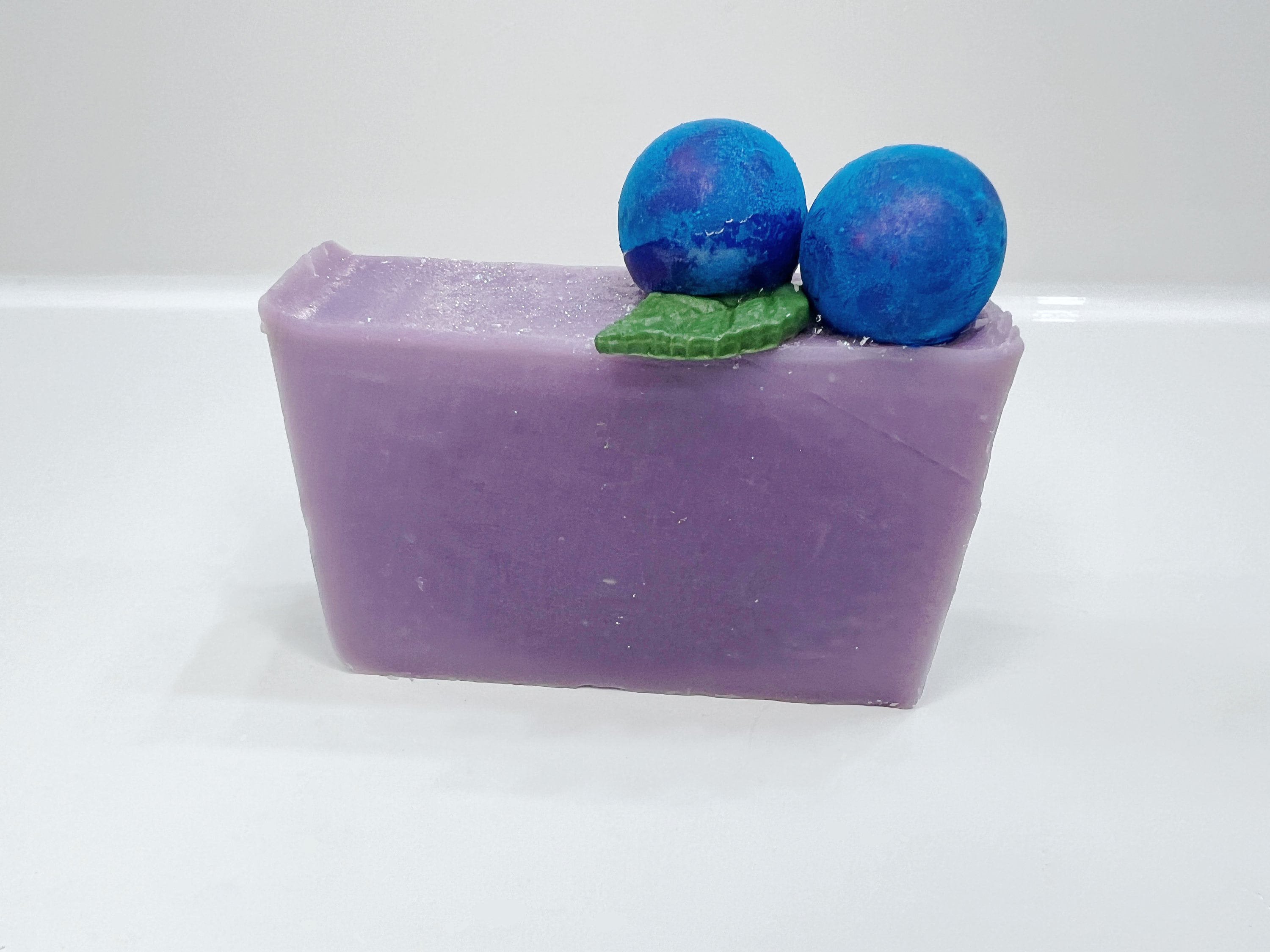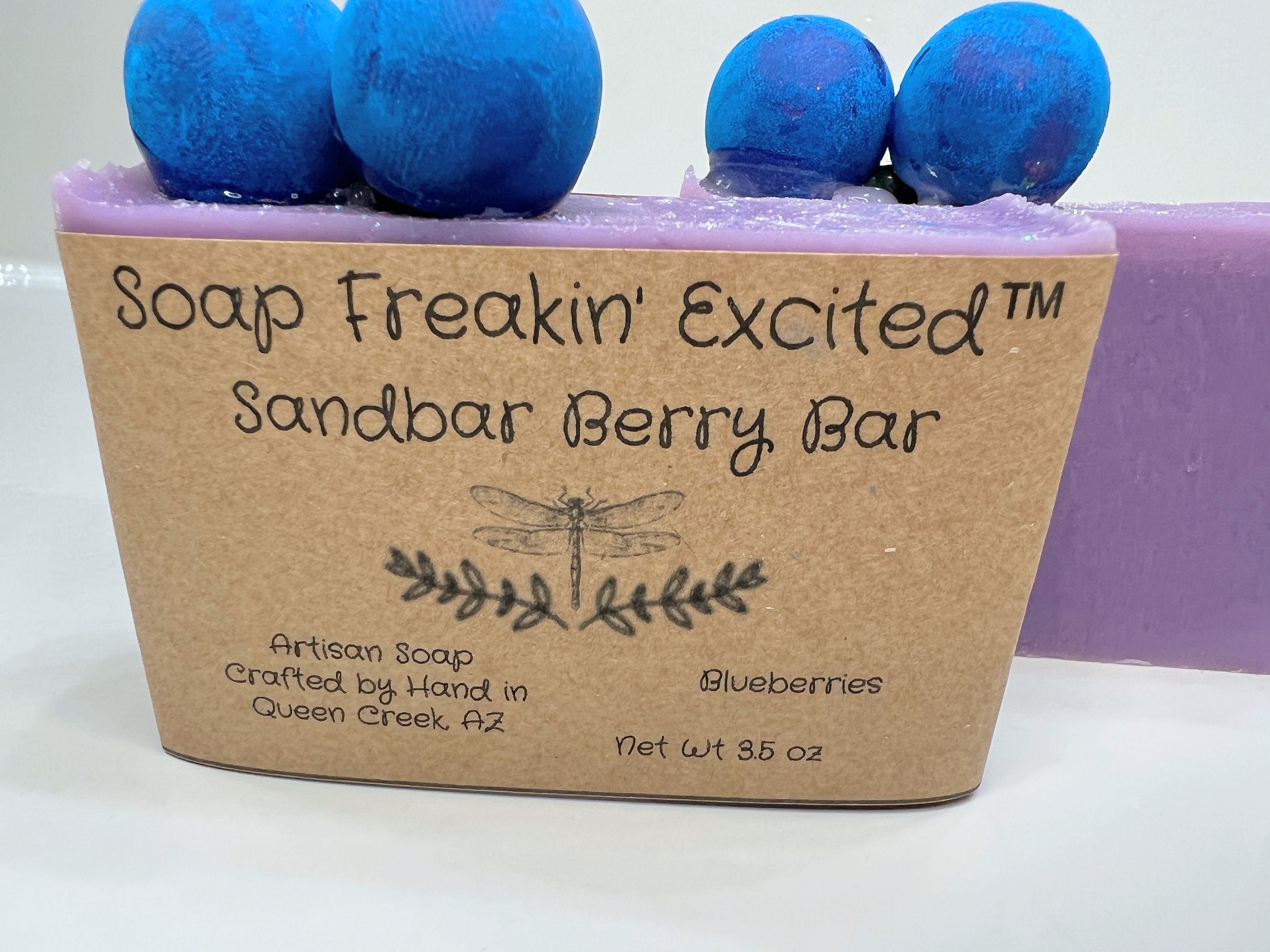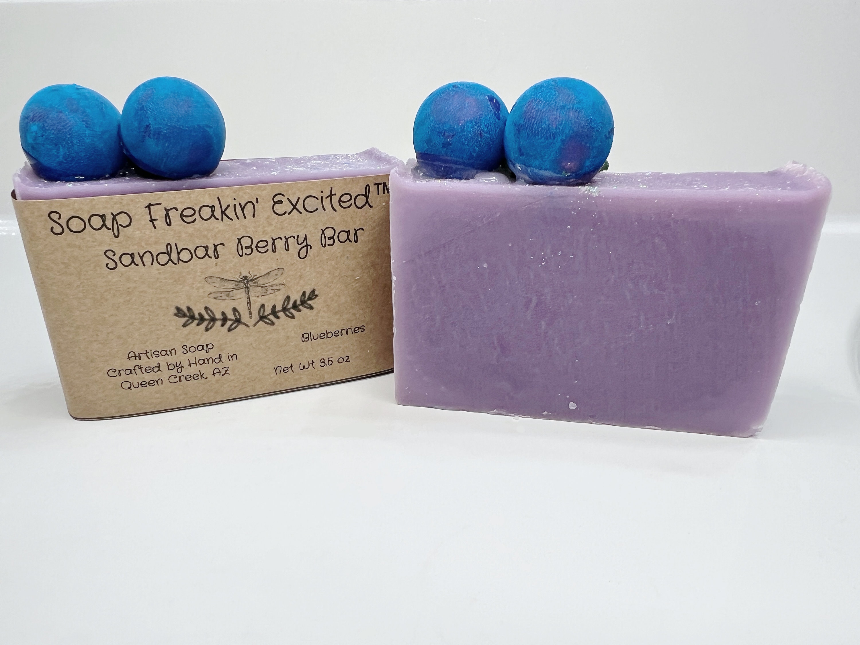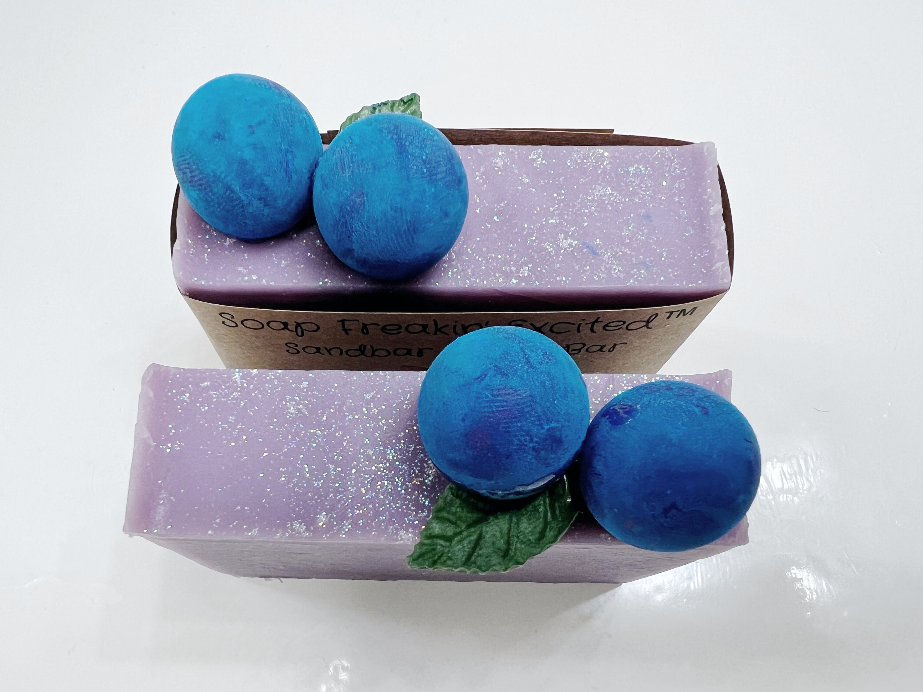 Sand Bar Berry Bar. Warm summer days of picking plump blueberries, is masterly infused into this bar. Brimming with blueberry fragrance and dusted with fine glitter. This soap has added goats milk for healthy, soft, beautiful skin!